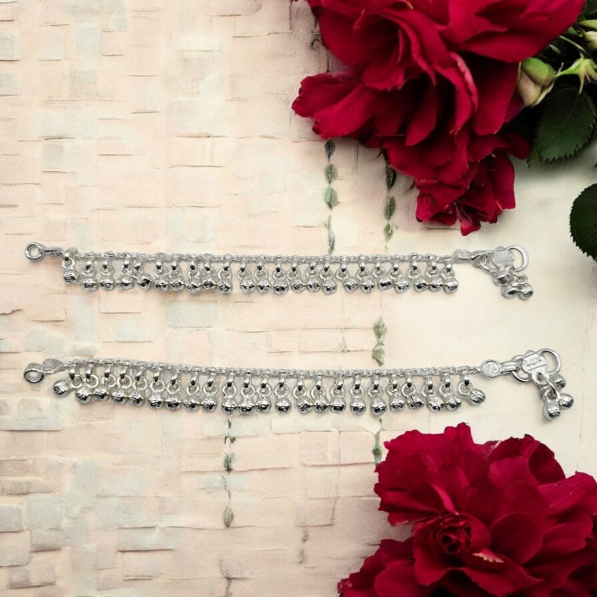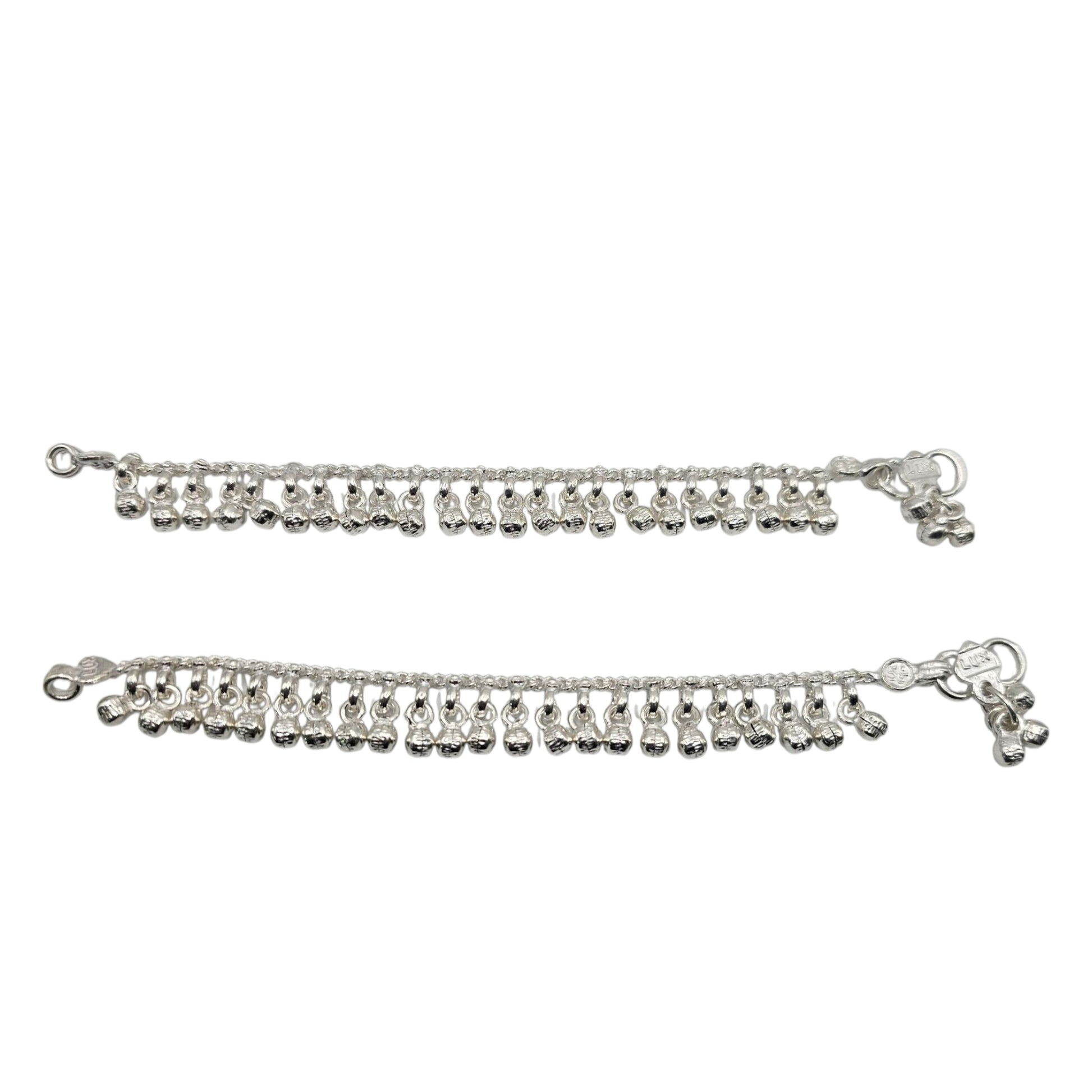 These silver kids’ anklets feature a delicate chain adorned with tiny dangling ghungroo-style charms that create a soft, pleasant jingle. Lightweight and comfortable, they’re perfect for everyday wear or festive occasions.