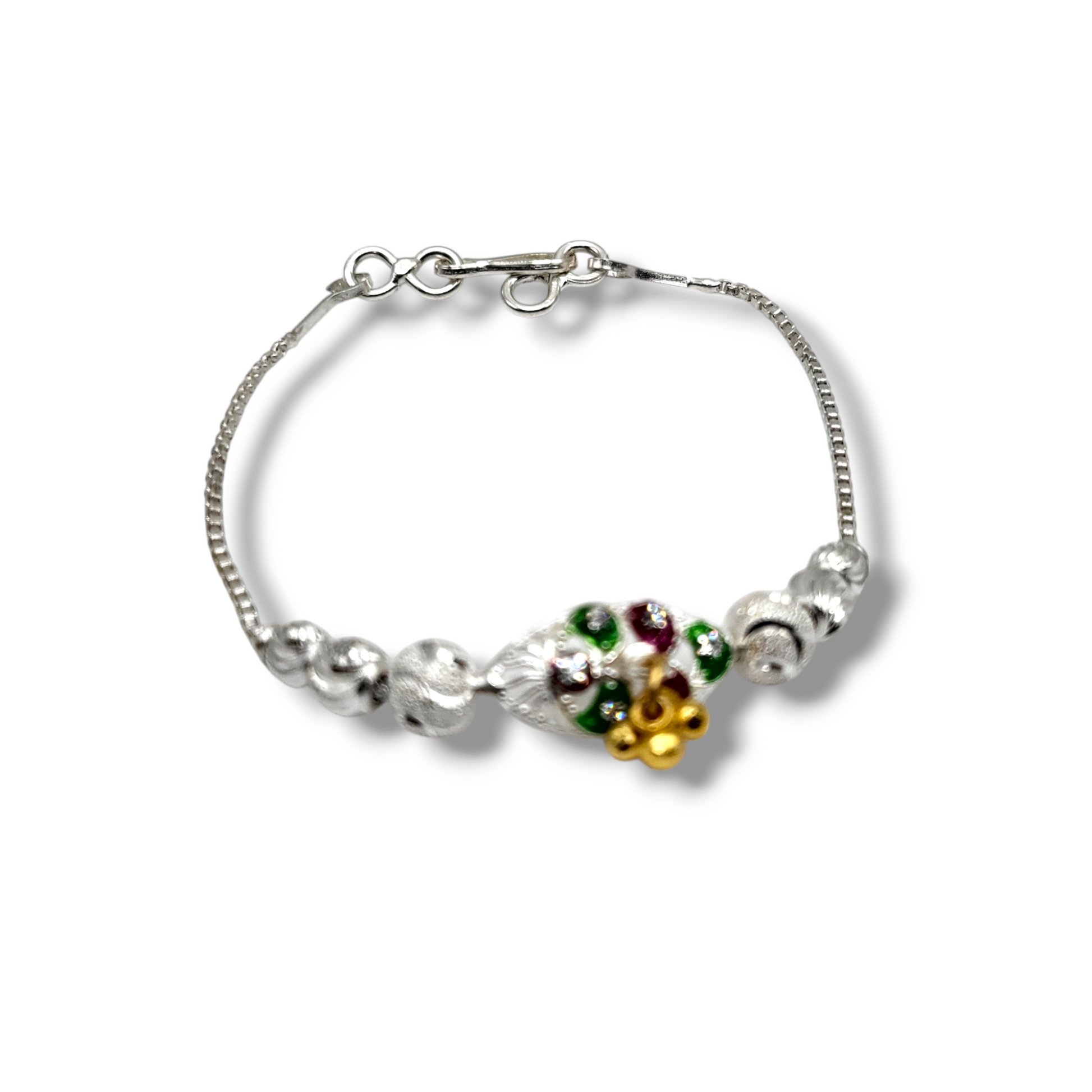 This baby shower rakhi is crafted from pure silver and features an adjustable size for a perfect fit. It weighs 7.3 grams, combining elegance with comfort for this special occasion.