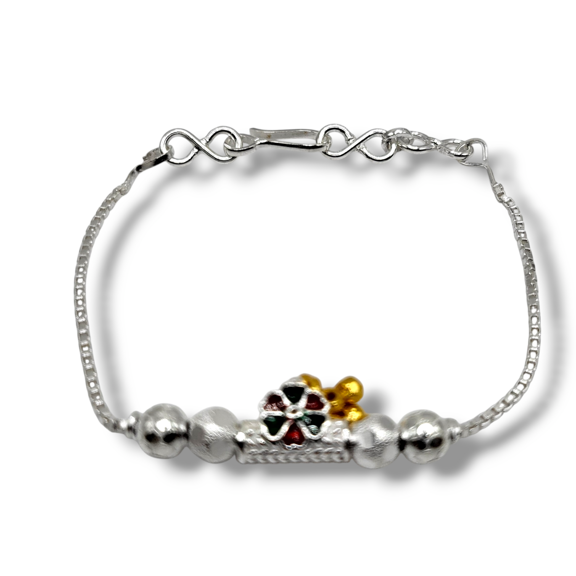 This baby shower rakhi is crafted from pure silver and features an adjustable band that fits wrist sizes ranging from 7 to 8.3 inches. It weighs 7.4 grams, combining elegance with comfort for a meaningful celebration.