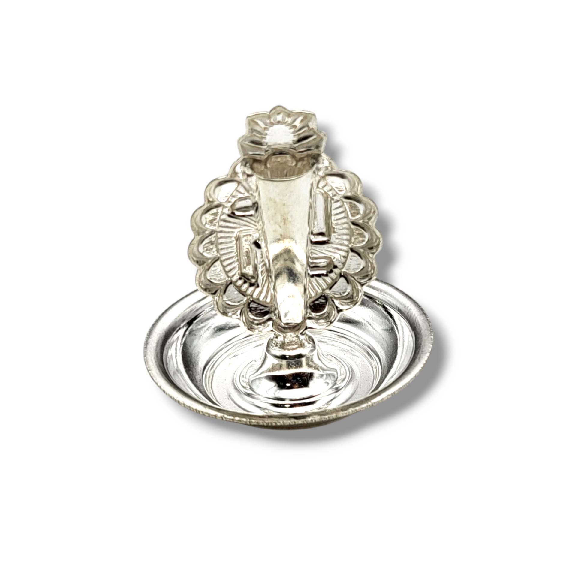 This dhoop stand is crafted from pure silver, weighing 17.2 grams. It features a base measuring 1.75 inches in diameter and stands 1.75 inches tall, combining elegance with functional design.