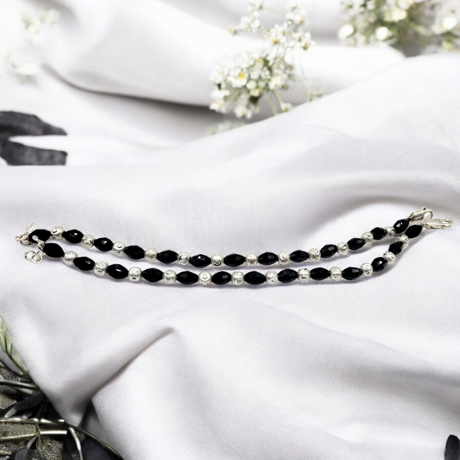 This pure silver Nazariya for infants is designed with alternating black beads and silver accents, traditionally believed to protect little ones from the evil eye and negative energies. Lightweight, skin-safe, and secured with a sturdy silver clasp, it’s perfect for daily wear and makes a meaningful gift for newborns, baby showers, and naming ceremonies. A blend of tradition, elegance, and comfort for your baby’s tiny wrists.