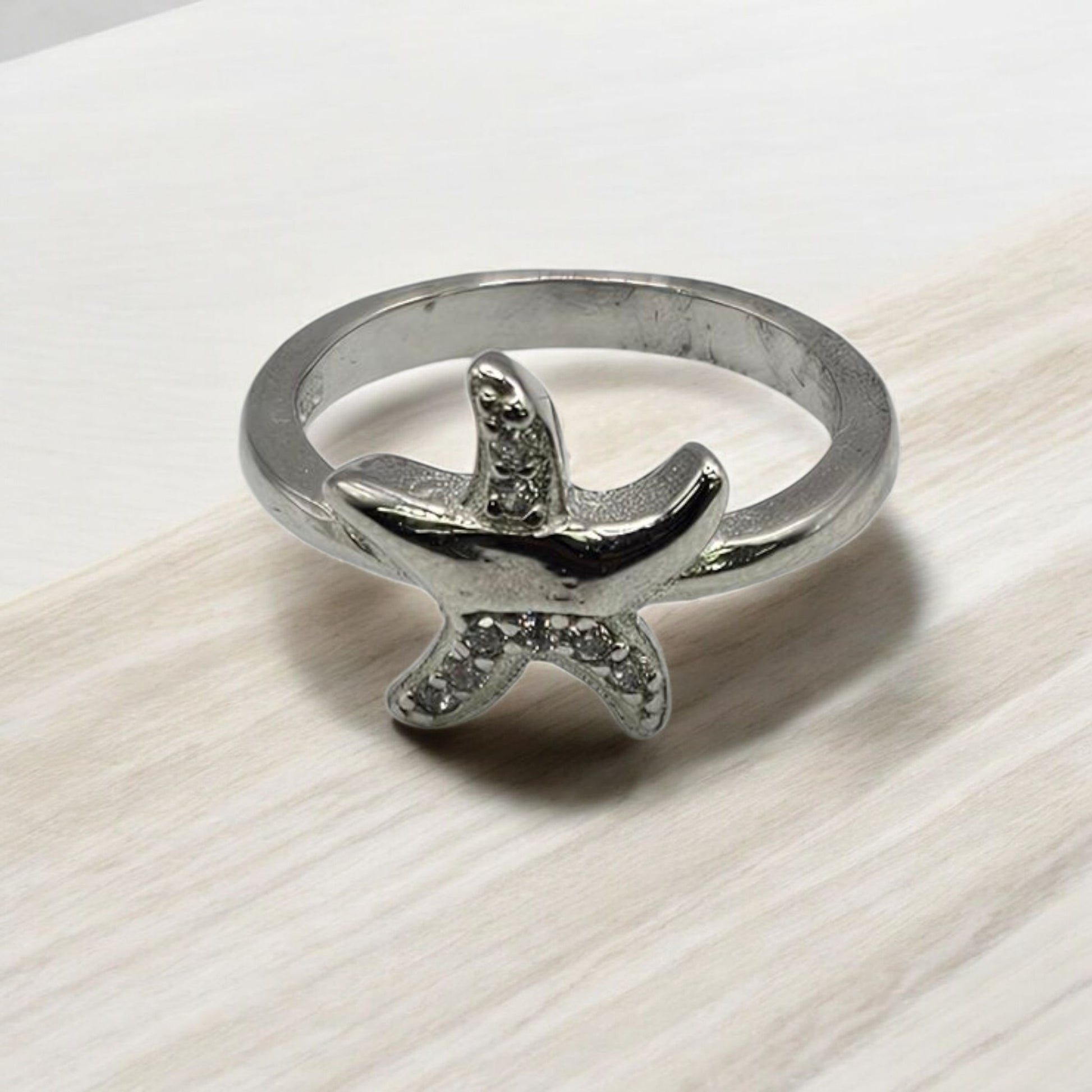 This elegant silver ring features a charming starfish design, platinum finish, symbolizing renewal and guidance. Crafted in sleek 925 silver with sparkling CZ accents, it captures a touch of ocean beauty—perfect for those who love coastal elegance and timeless charm.