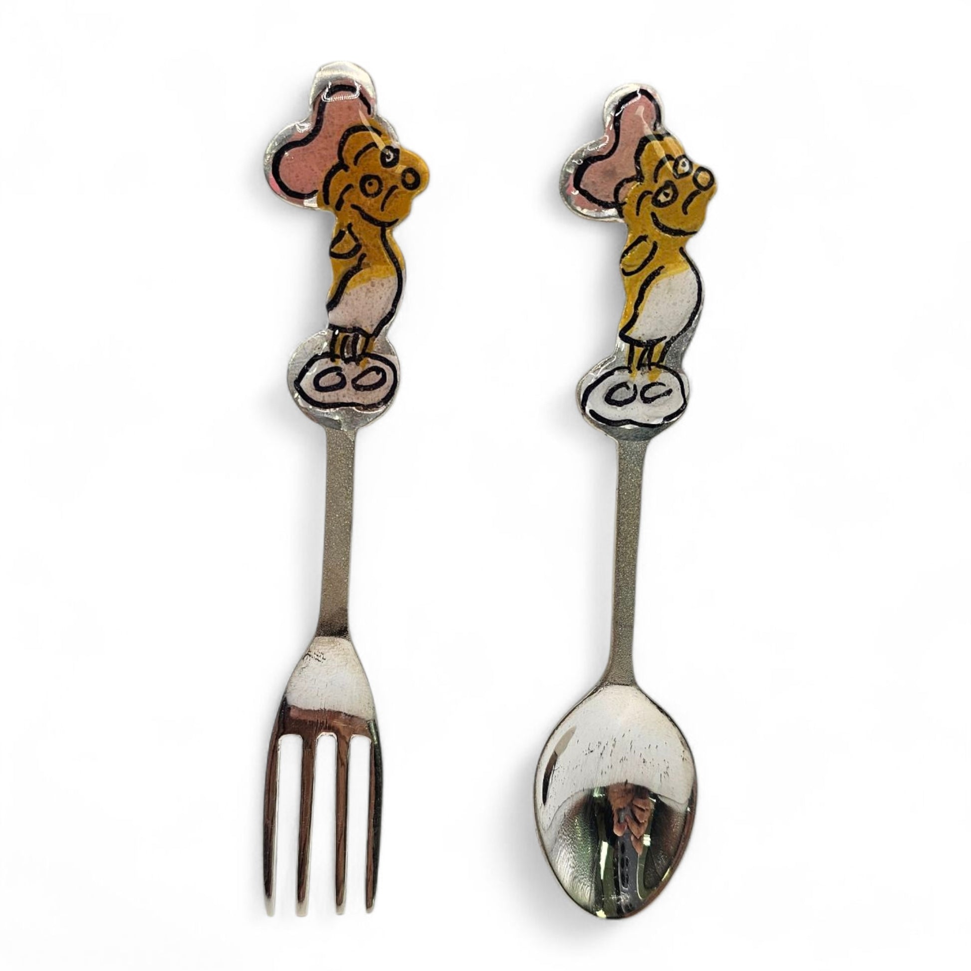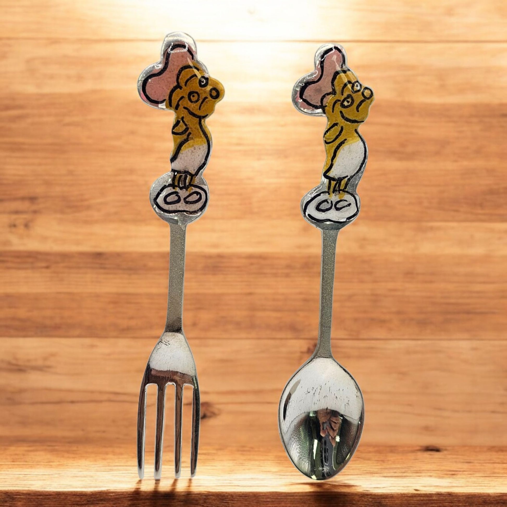 A cute and charming silver fork-and-spoon set designed specially for kids, featuring an adorable cartoon-style character at the top. The colorful enamel figure adds a fun and playful touch, making mealtime more enjoyable for little ones. Crafted in high-quality silver, this set is durable, safe, and perfect as a gift for birthdays, naming ceremonies, or daily use.