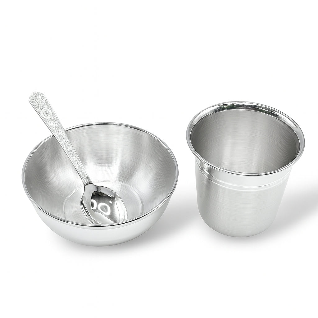 Celebrate your baby’s first sacred feeding ceremony with this elegant Silver Annaprashan Set. Crafted in pure silver, the set includes a smooth-finish bowl, a gentle spoon, and a classic glass — designed for safe, hygienic, and auspicious use. The minimal yet traditional design makes it a meaningful keepsake, symbolizing health, prosperity, and blessings for the child’s beautiful beginning.