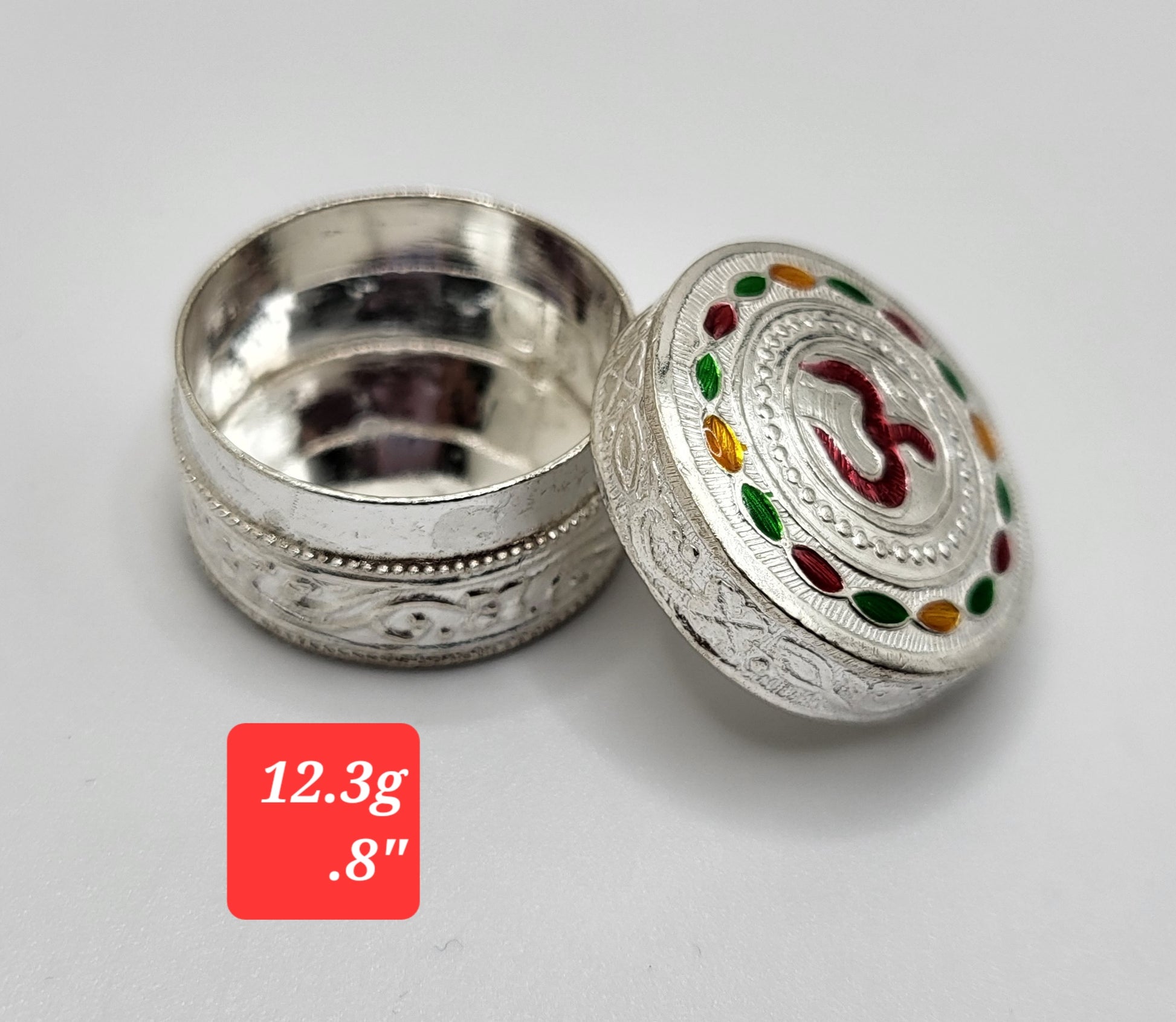 This pure silver dabbi, also known as a silver box, is designed to hold sindoor, haldi, or kumkum. It comes in various sizes, with this model weighing 12.3 grams and measuring 0.75 inches in width and 0.5 inches in height.