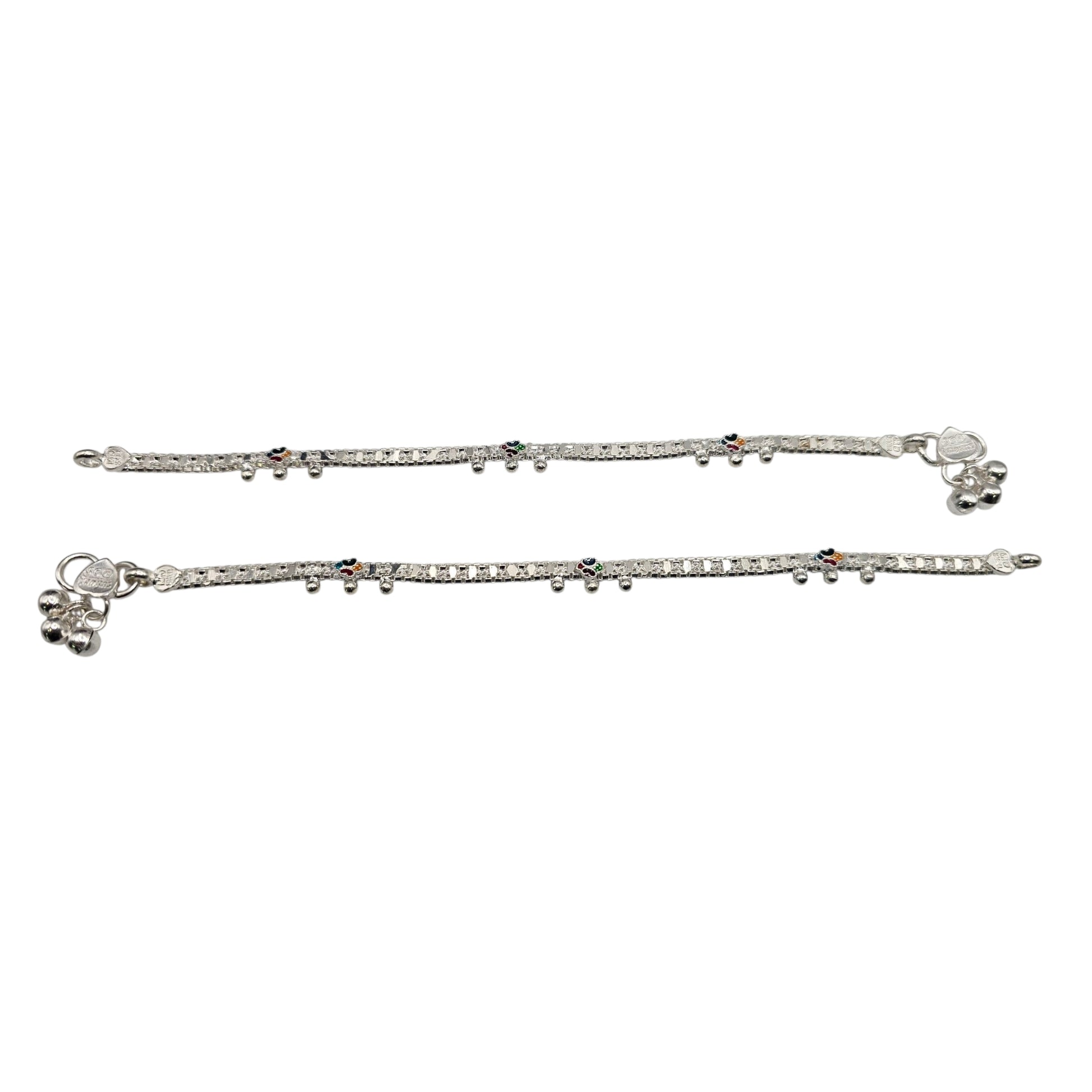 Add a touch of charm to any outfit with this beautifully crafted Silver Girls Anklet. Designed with delicate detailing, it features a sleek silver chain adorned with tiny dangling beads and subtle multicolor floral accents that create a playful yet elegant sparkle with every step. The lightweight design ensures comfort, while the classic silver shine makes it perfect for daily wear or special occasions. A lovely blend of tradition and modern style—ideal for girls who love a little shine around their ankles.