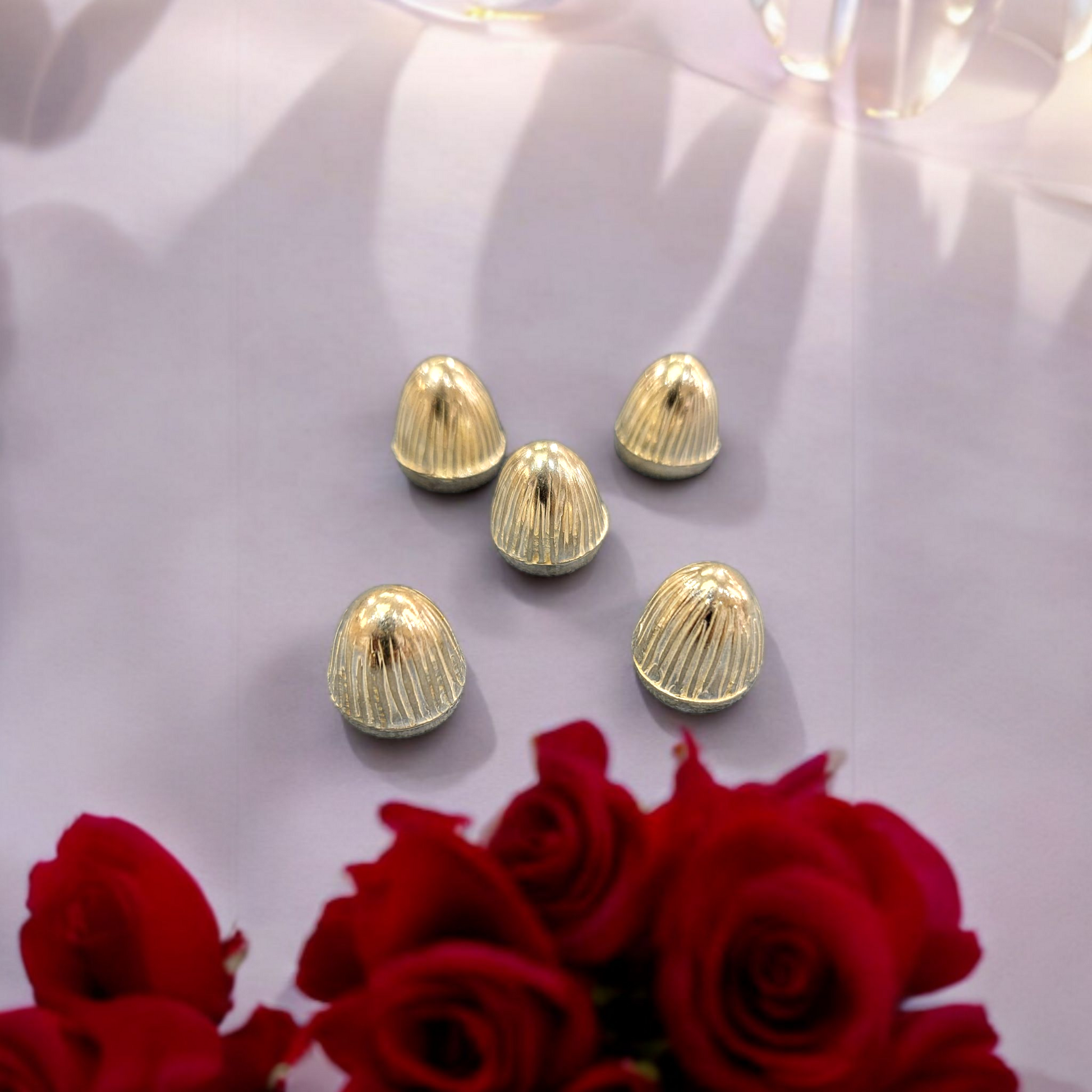 This set includes five pieces of pure silver Beetal nuts (sopari). Designed for religious purposes, each nut measures approximately 0.5 inches in both base diameter and height, ensuring authenticity and traditional significance.