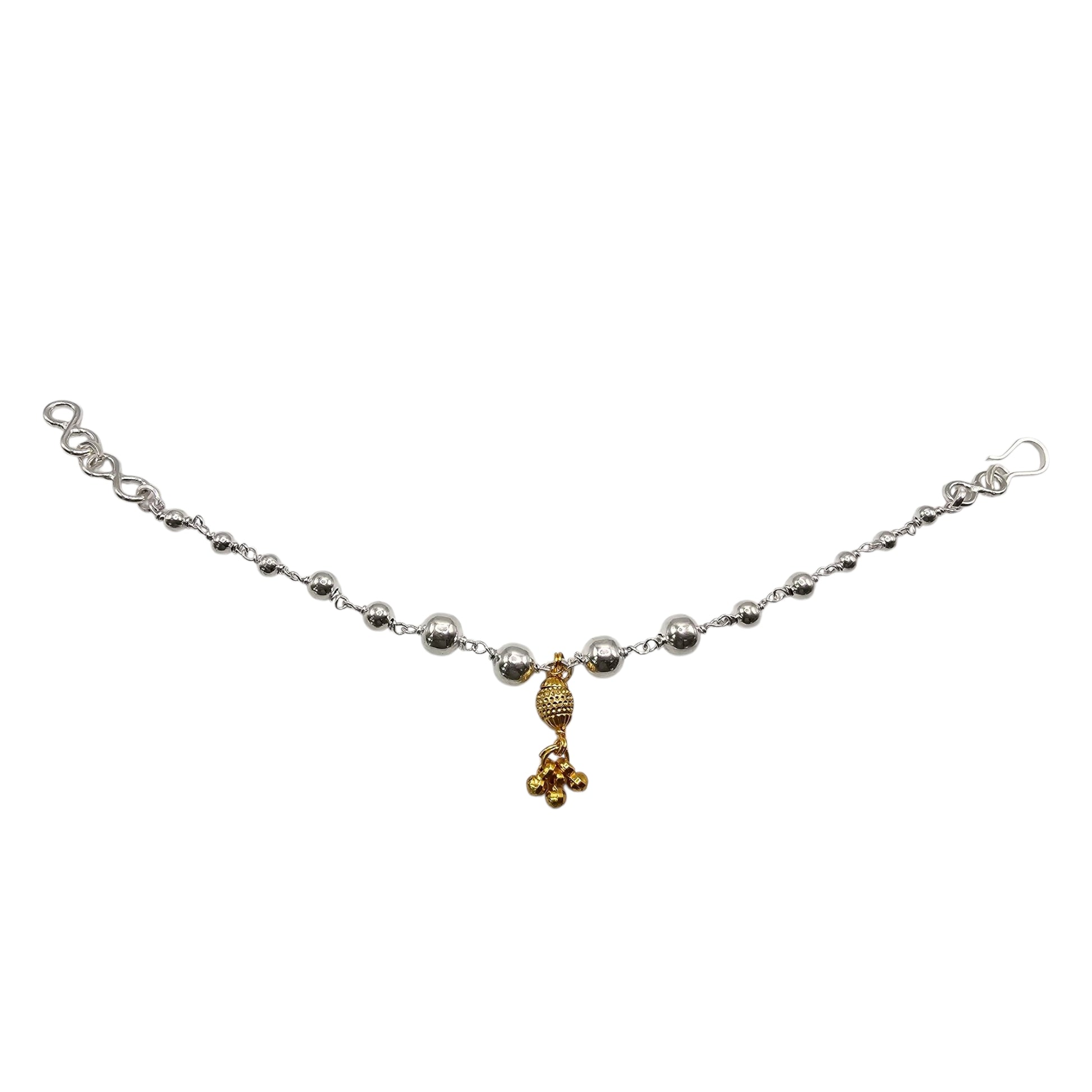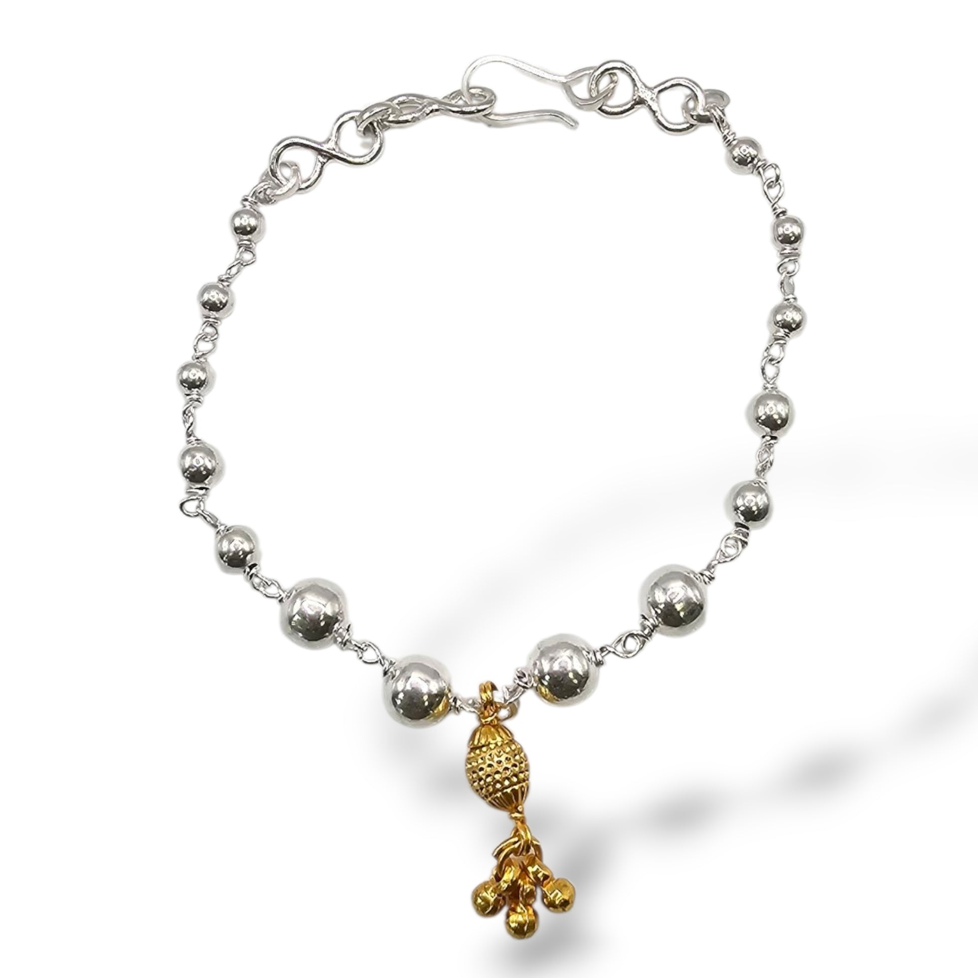 This rakhi features a graceful silver anklet-style chain adorned with evenly spaced spherical beads, connected by delicate links. At its center lies a striking gold-toned pendant with a textured surface, surrounded by tiny dangling charms that add movement and charm. The hook-style clasp ensures easy fastening, making it both functional and ornamental. The blend of silver and gold tones evokes purity and prosperity—perfect for celebrating new beginnings and the joy of motherhood.