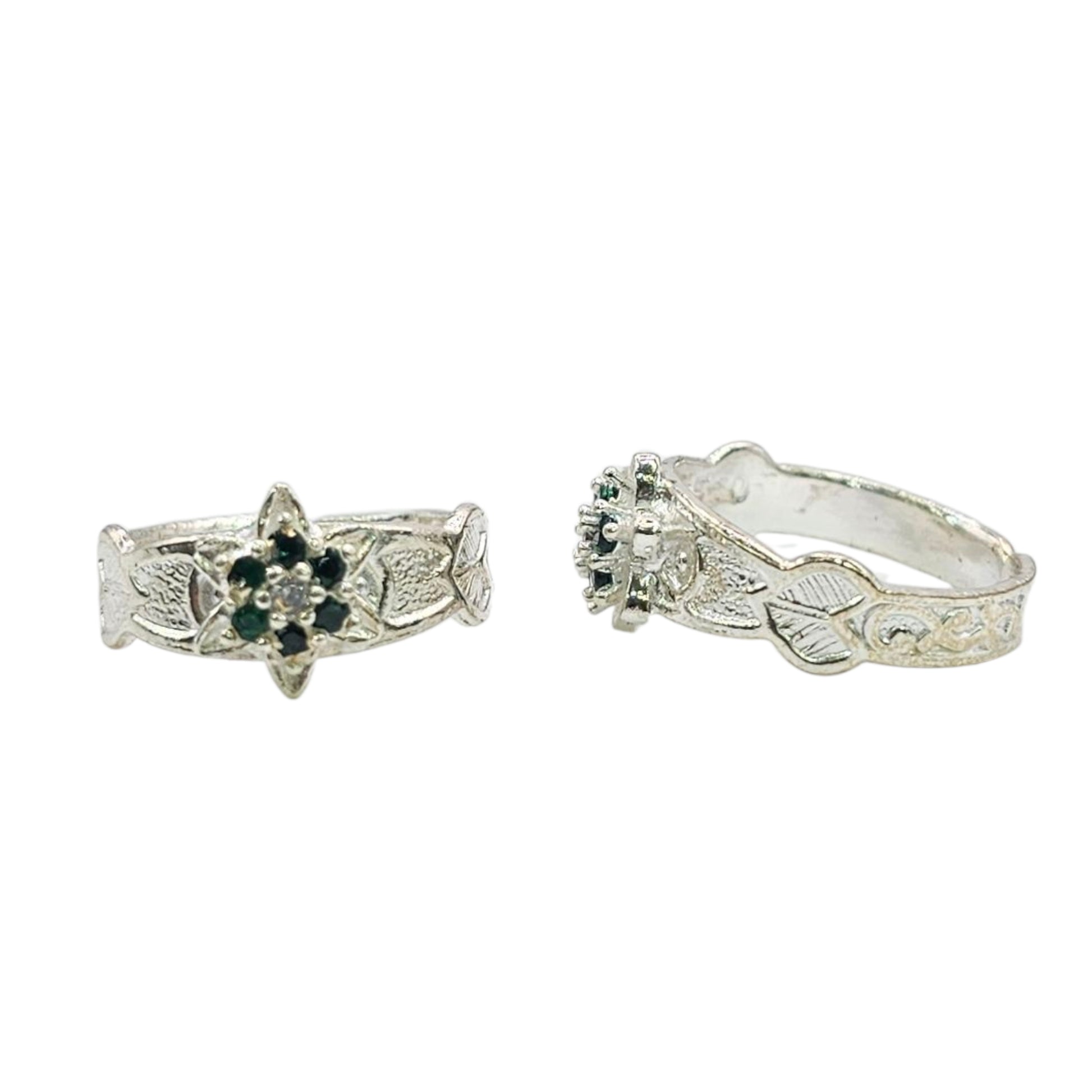 Elegant silver toe rings featuring a floral design with green stones and intricate leaf engravings — adjustable for a perfect fit and everyday charm.