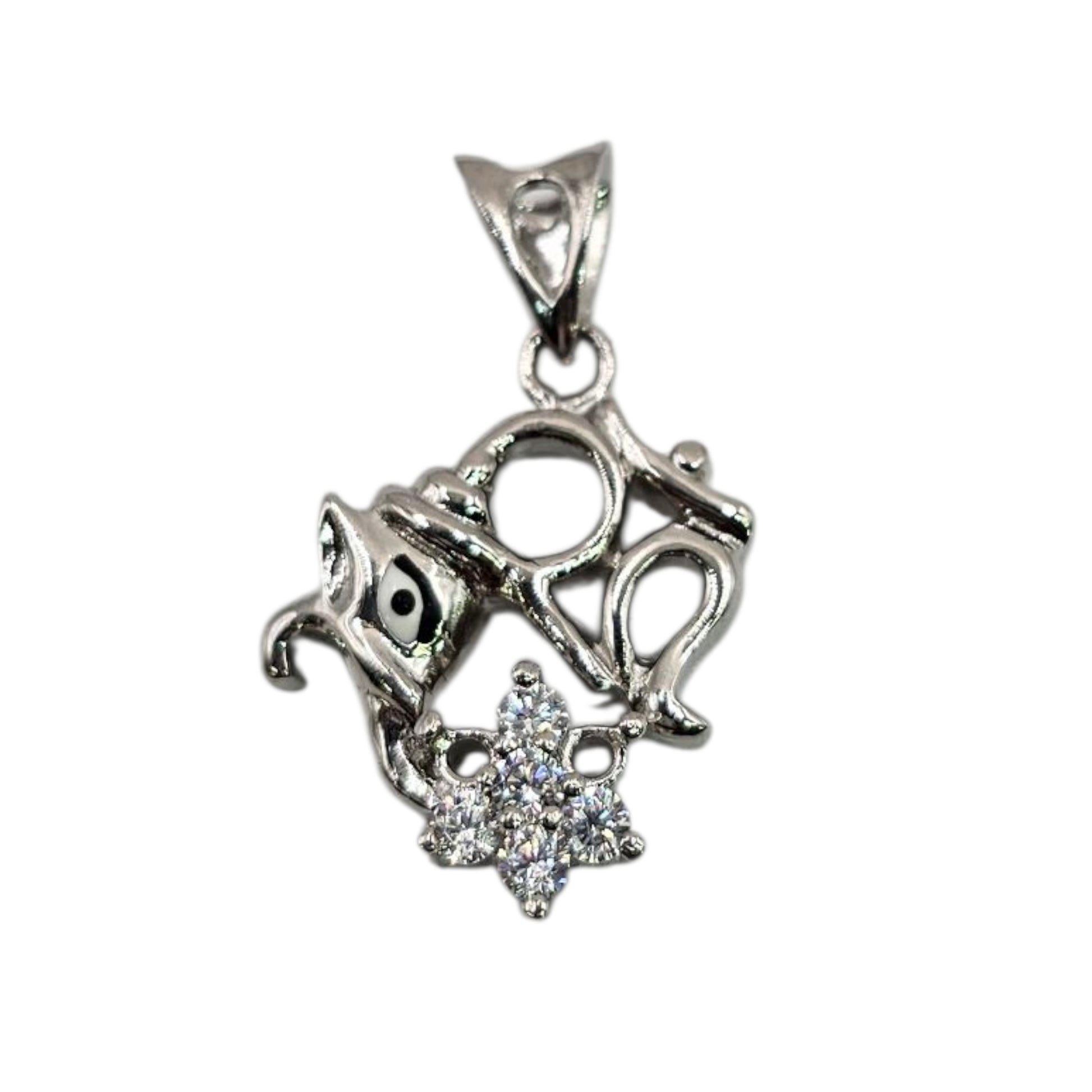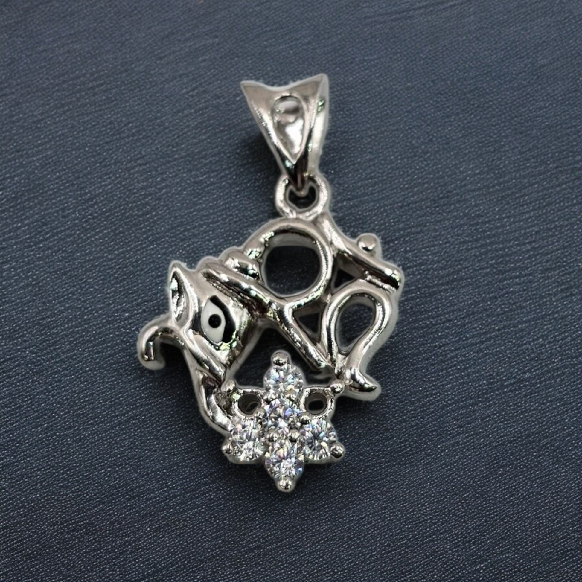 This artistic Lord Ganesh silver pendant features a modern abstract design with a sparkling stone-studded flower at the base, symbolizing purity and divine energy. The intricate detailing of Lord Ganpati’s face adds a touch of grace and spirituality, making it a perfect fusion of devotion and contemporary style.