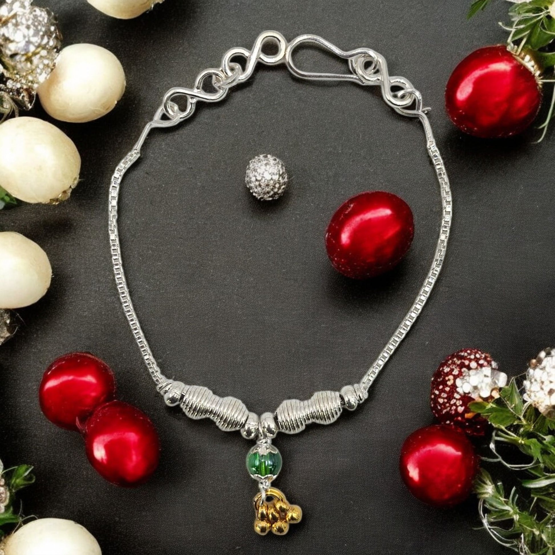 Welcome the little one with this Silver Twirl Baby Blessing Rakhi, crafted in pure silver and designed with elegant spiral beads that symbolize growth, protection, and new beginnings. The center features a soft green bead paired with a tiny golden baby rattle charm, adding the perfect baby shower touch. Lightweight, stylish, and reusable as a bracelet, this rakhi makes a beautiful keepsake for the mom-to-be—filled with blessings, love, and celebration.