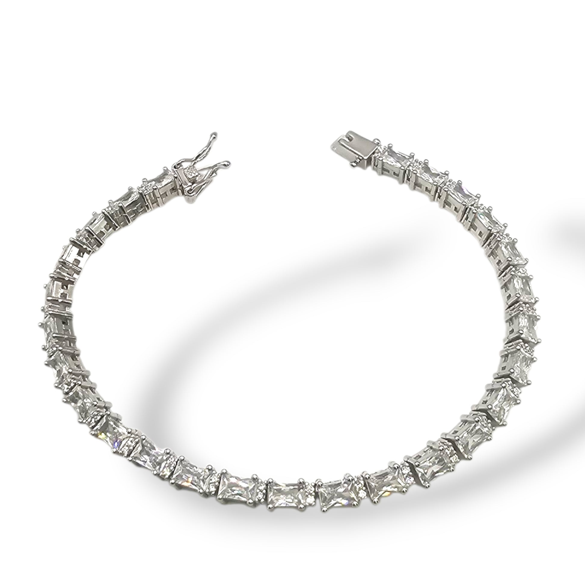 A regal silver bracelet adorned with precisely set sparkling stones, crafted to reflect refined grandeur and royal elegance. The structured silhouette and radiant brilliance create a statement of sophistication, making it perfect for weddings, evening occasions, and heirloom-inspired styling. Designed to drape gracefully on the wrist, this bracelet embodies luxury with a commanding presence.